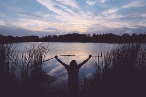 Silhouette of person with arms raised in triumph at sunset lake. Peaceful moment of achievement and reflection in nature. Inspirational landscape photography with dramatic sky and water reflections.